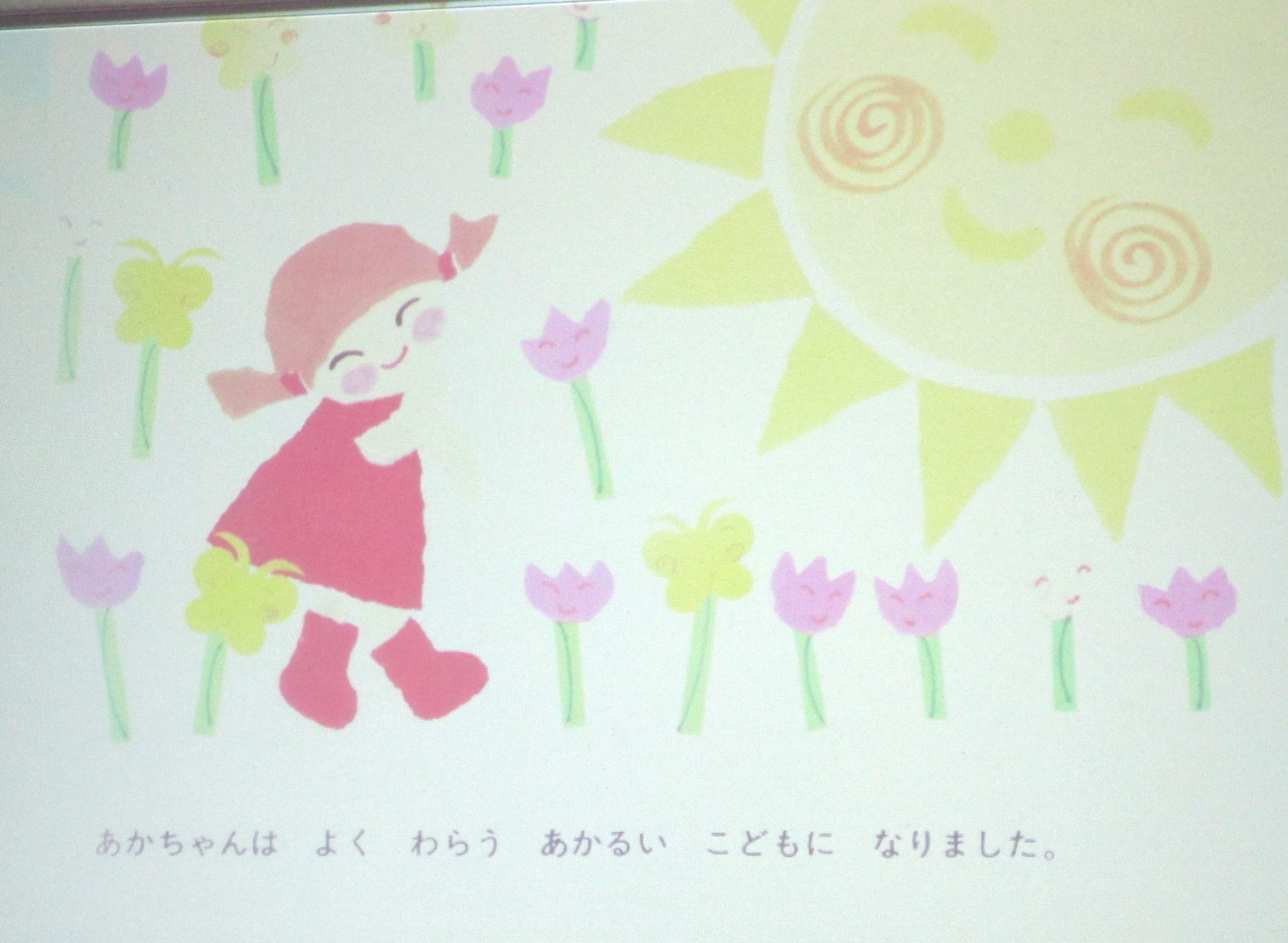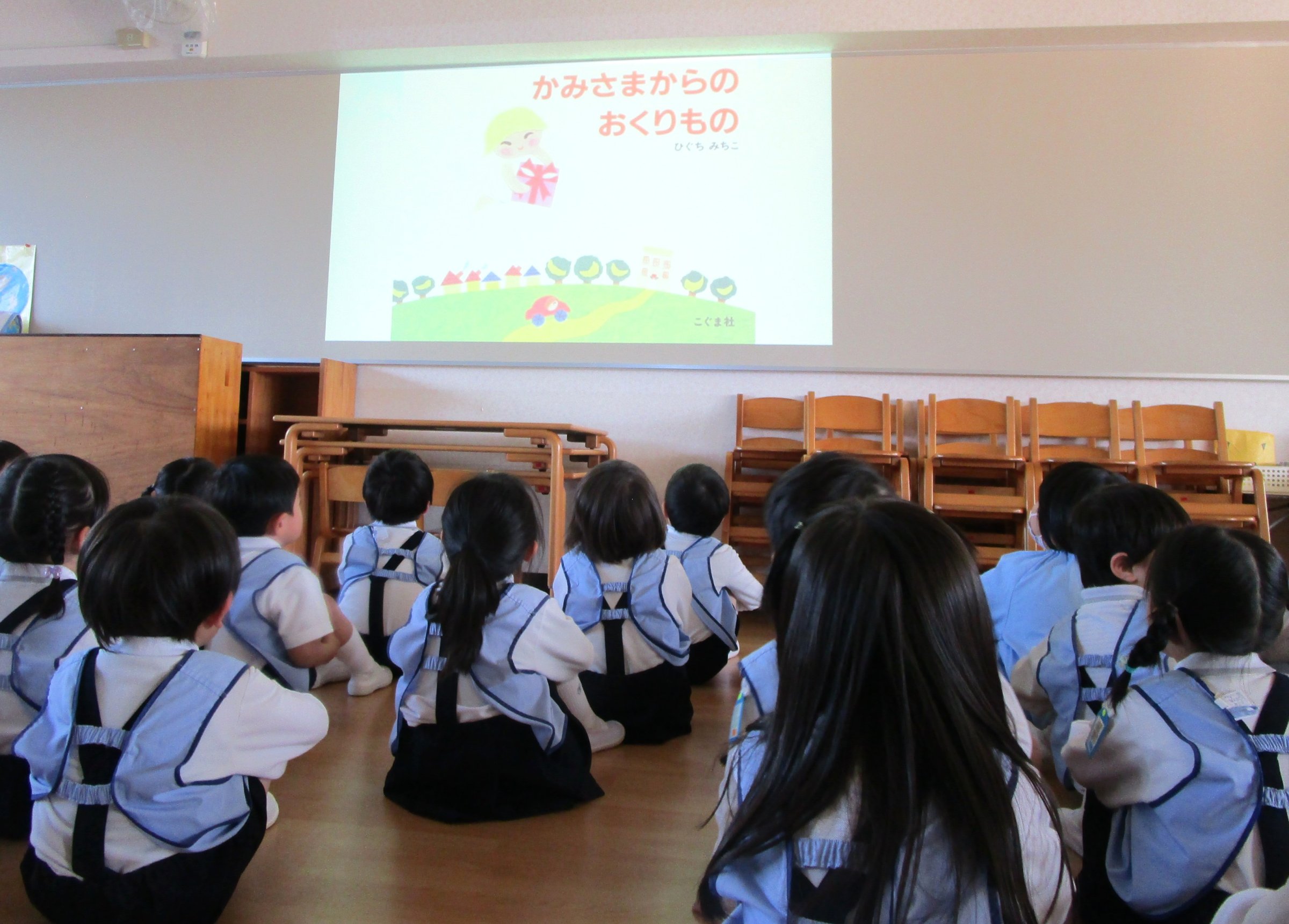 今日は、横割り活動の時間に年中児が園長による神様のお話を聞きました。
