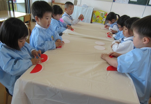 丸く切った赤い折り紙で折っているのは・・・『カーネーション』!!