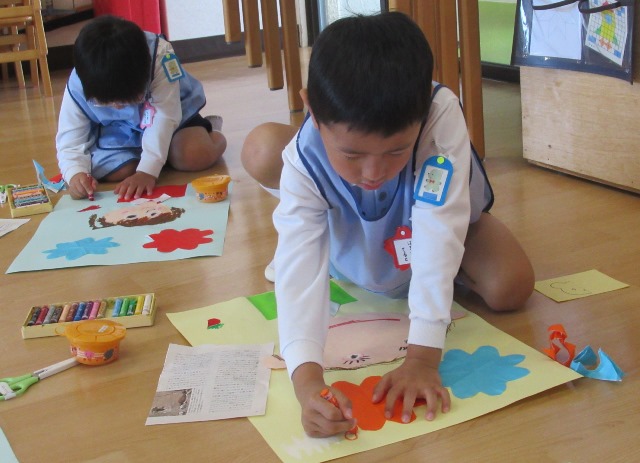 大好きなお母さんの顔の周りに、切り紙したお花をのり貼りしました!