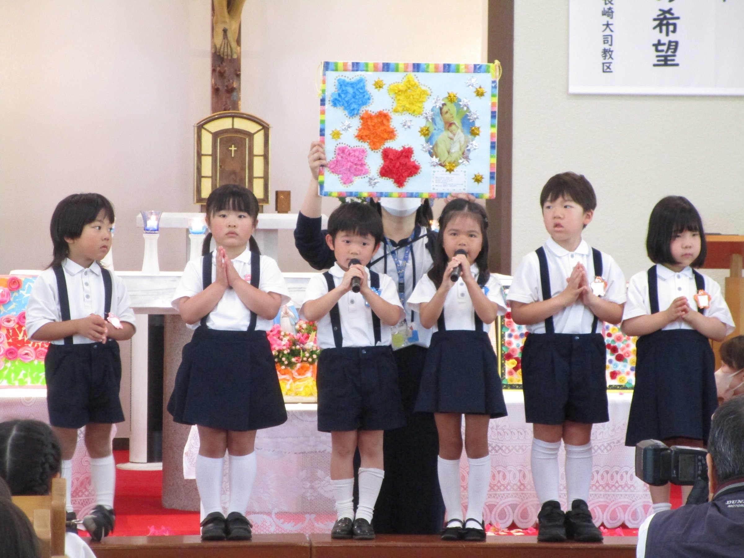 世界平和のため、家族のため、5月にマリア様を通していただいたお恵みに感謝し、これからもよい子どもでいられるよう、みんなでお祈りをしました。