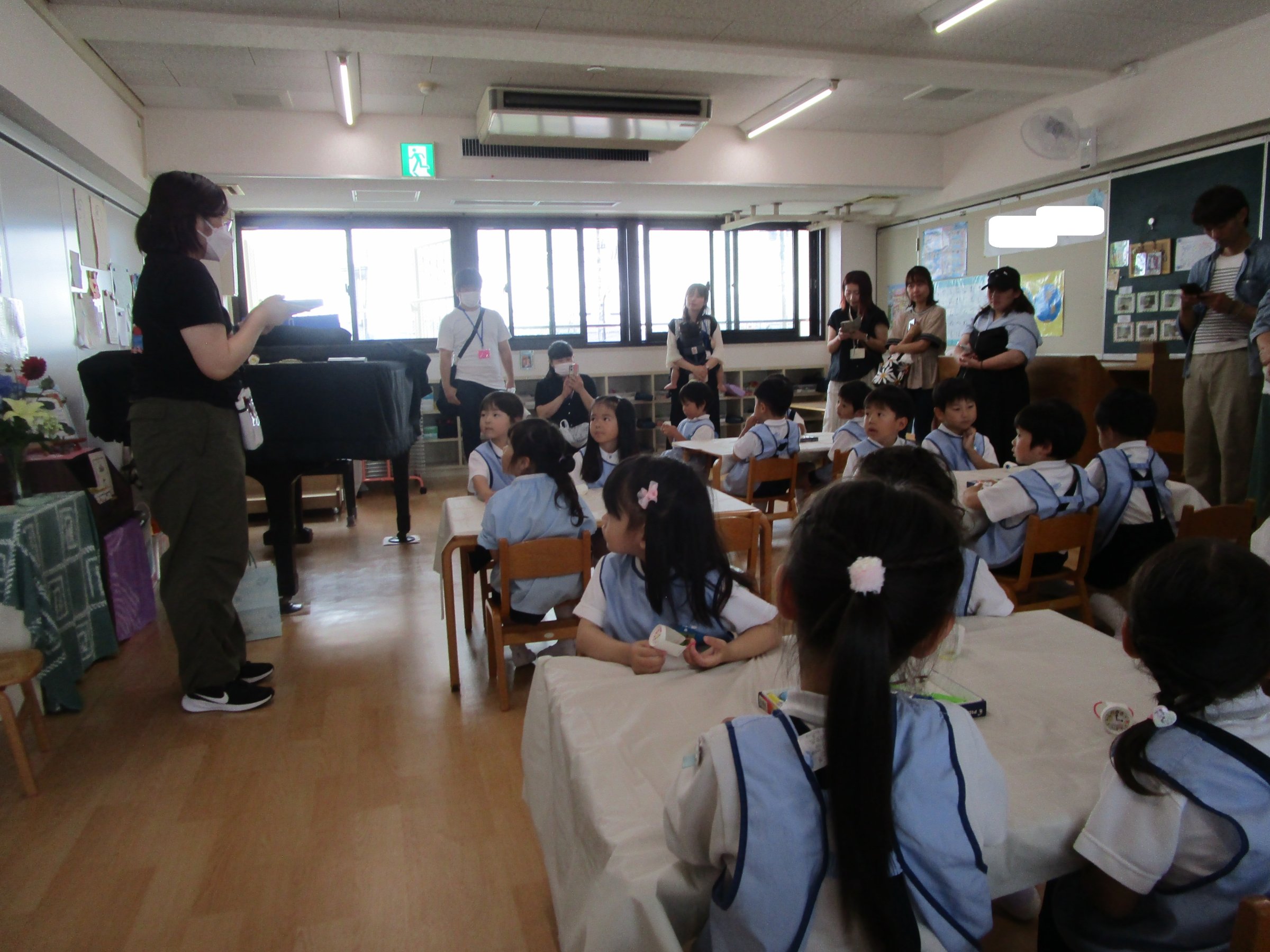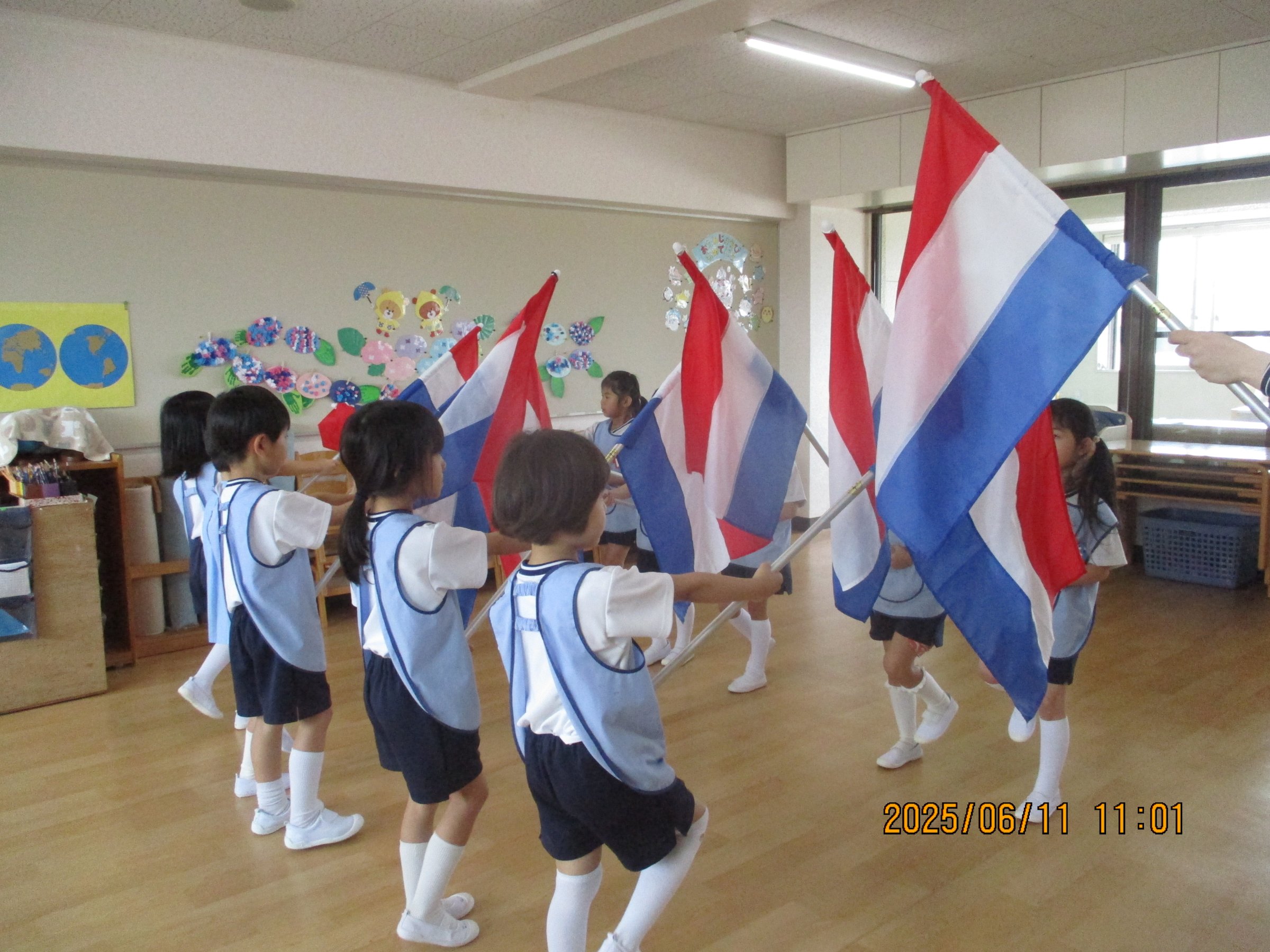 水遊び期間中、誰もけがや事故が起こらず安全に遊ぶことができますように、お守りください、と中庭に全園児が集まり、お祈りを捧げました。