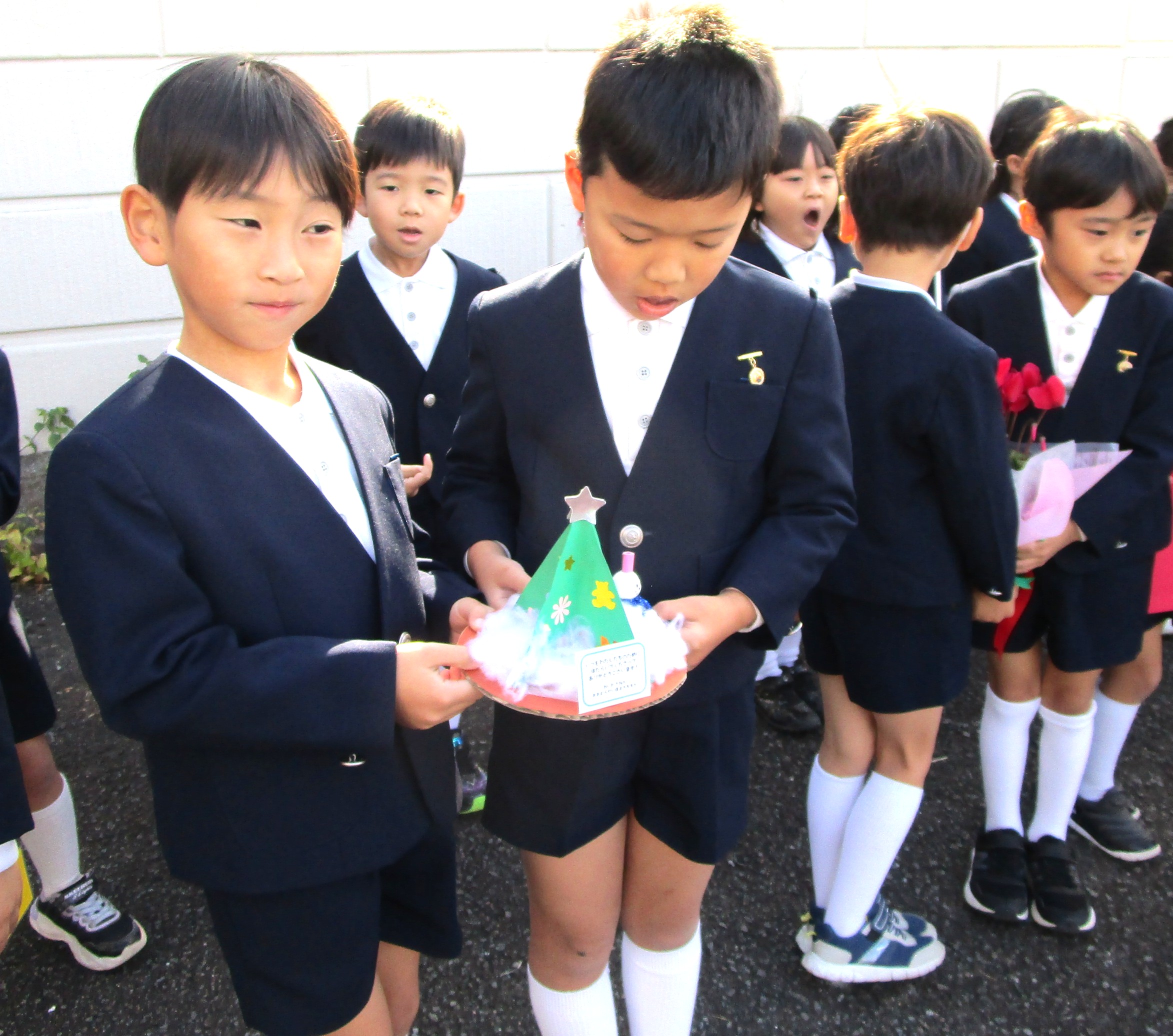 子どもたちが書いた感謝状や、手作りのクリスマスツリー、シクラメンをプレゼントし感謝を伝えました!
