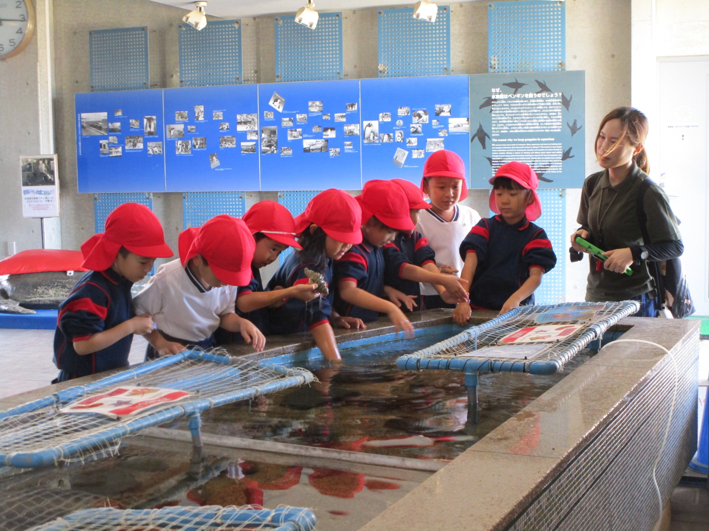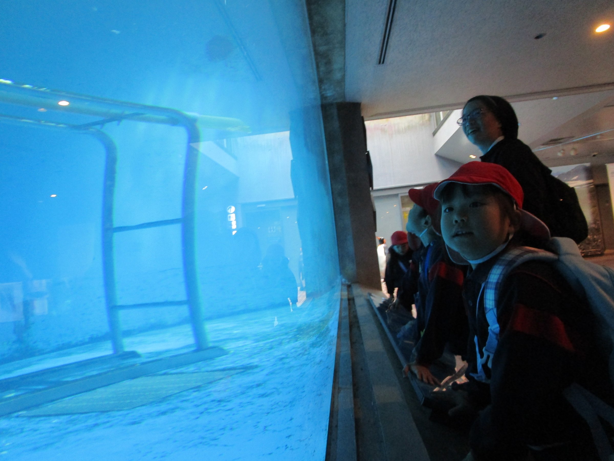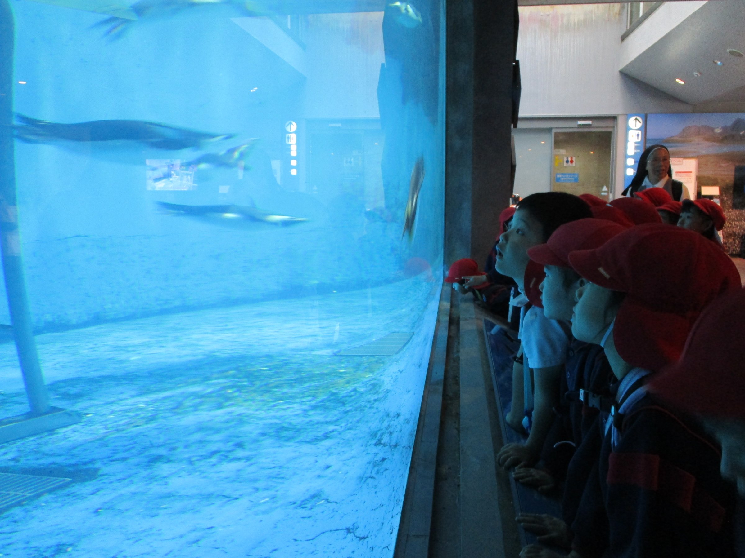 大きな水槽で気持ち良さそうに泳ぐペンギンたちが、子どもたちを迎えてくれました!