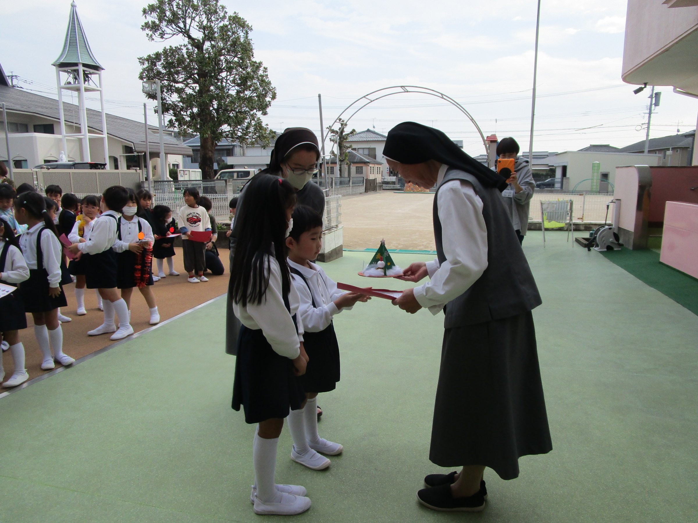 幼稚園でも全園児が中庭に集まり、園長先生や教頭先生、担任、副担任など職員に感謝を伝えました!