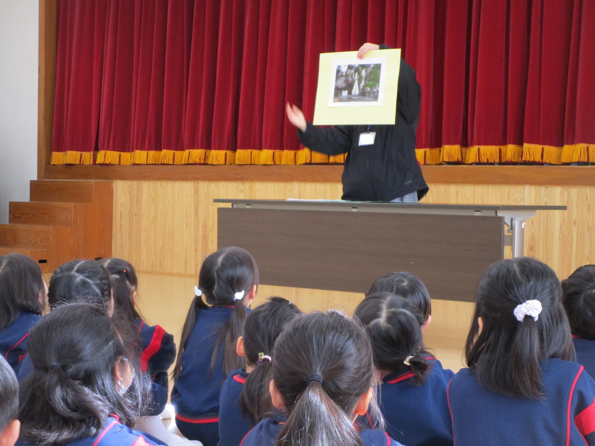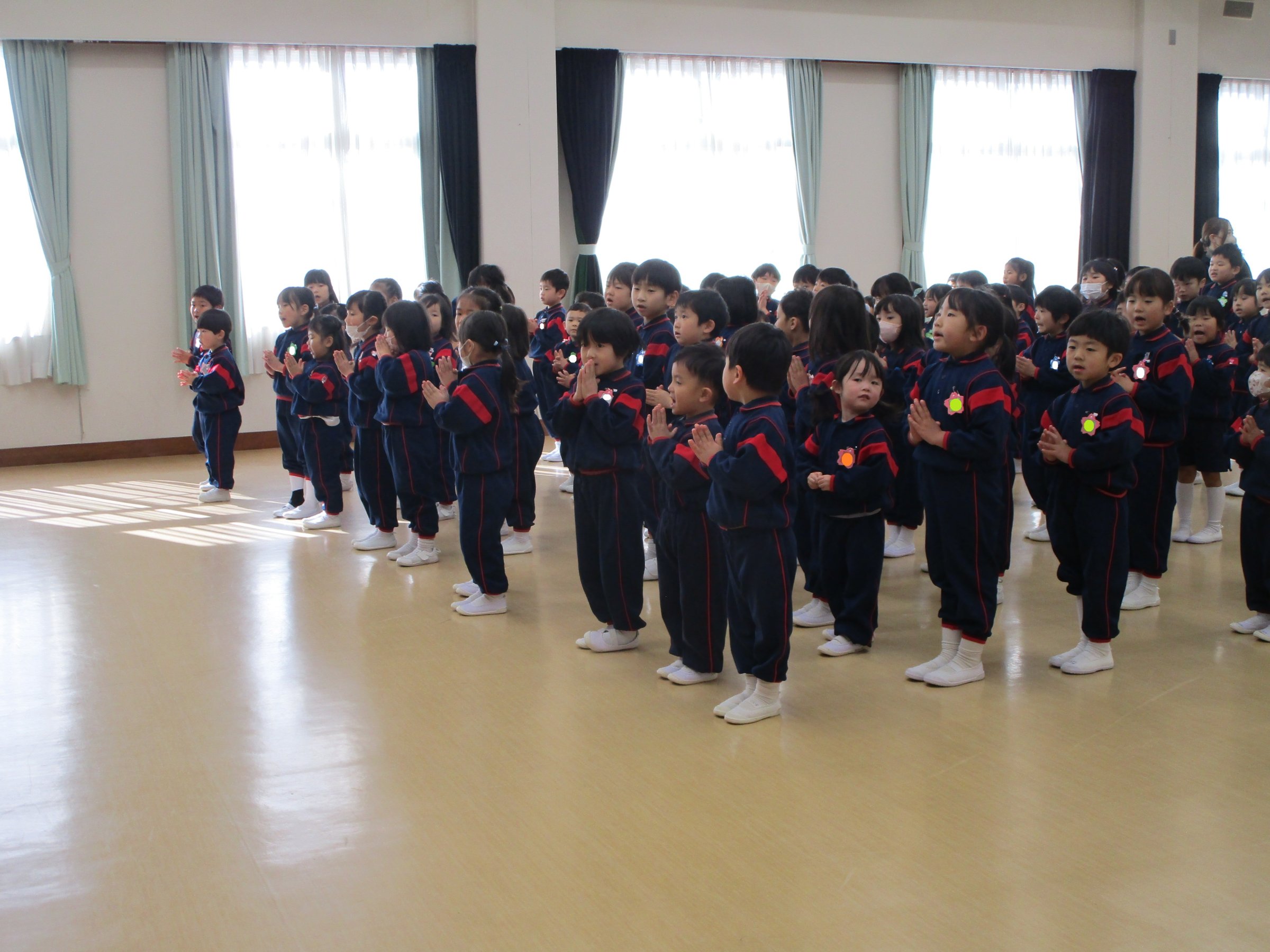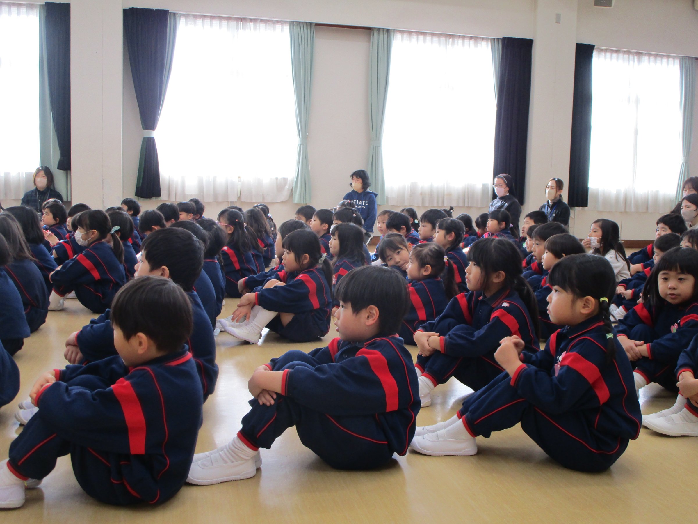 今日は、全園児が信徒会館に集まり、園長先生による神様のお話を聞きました。