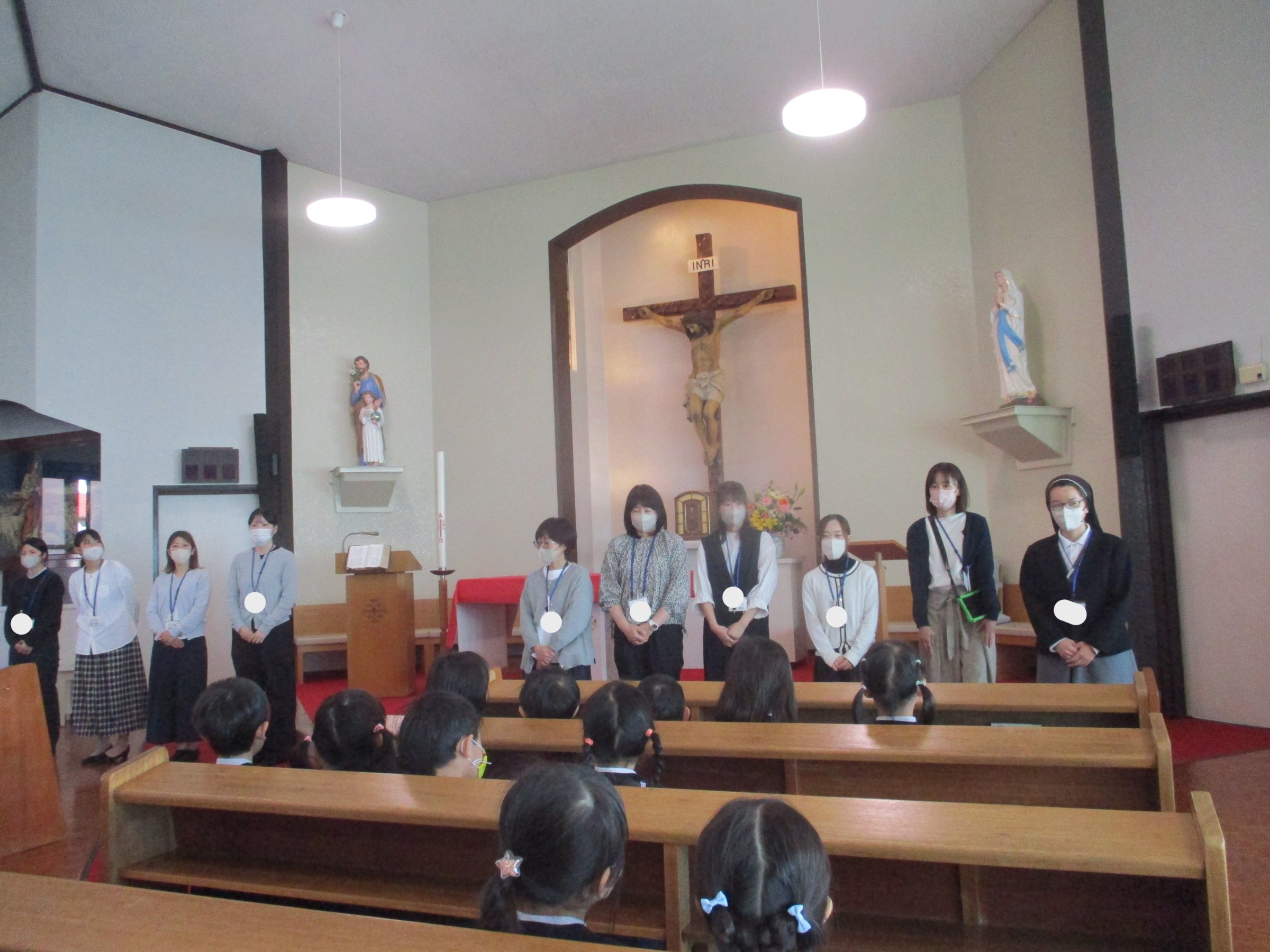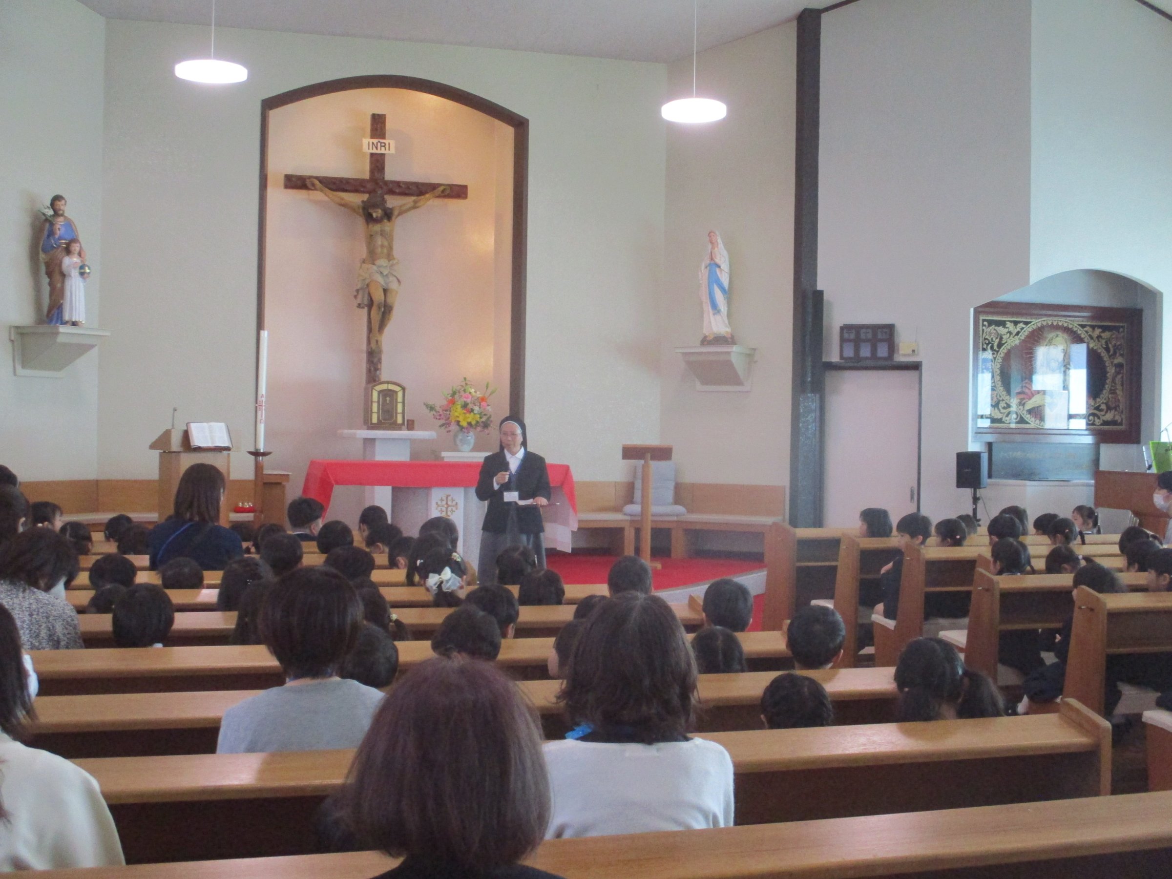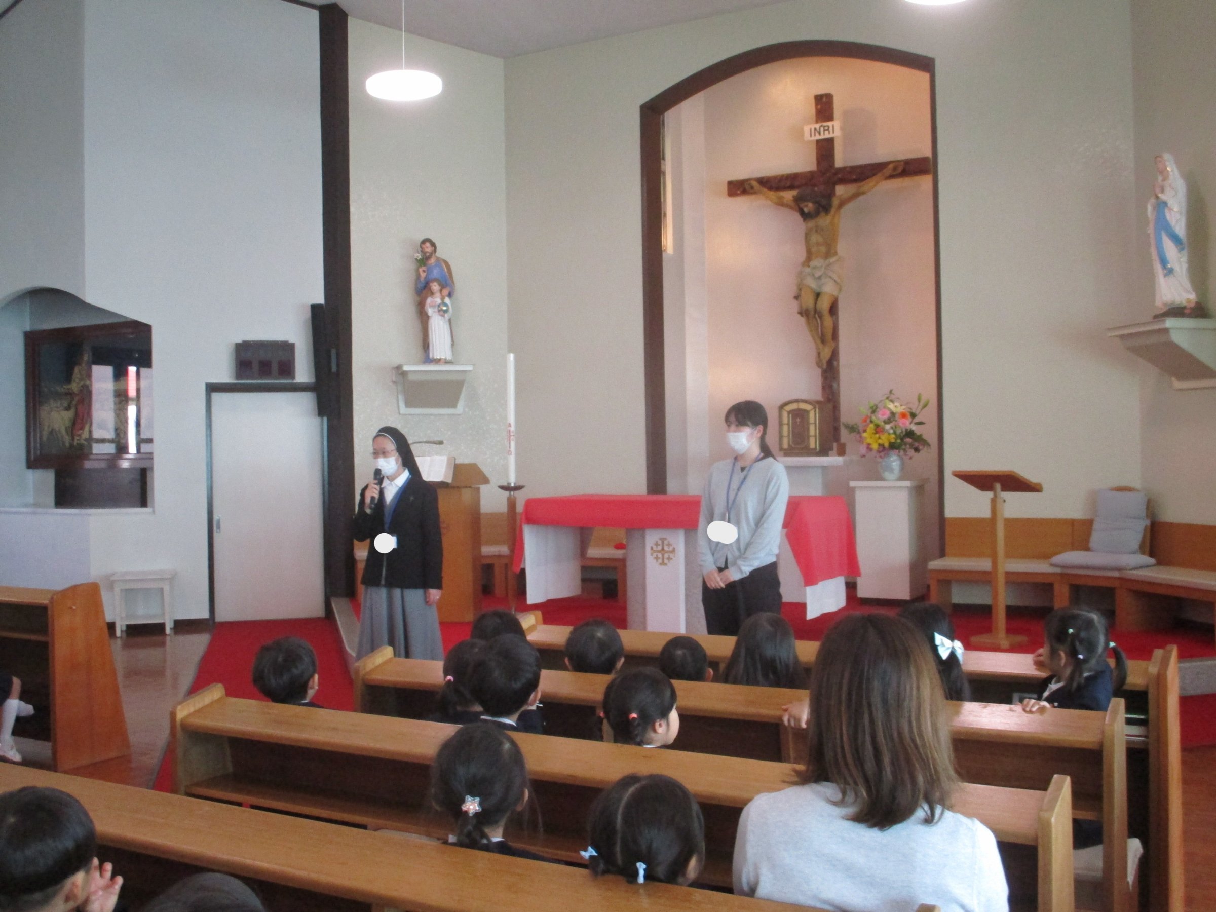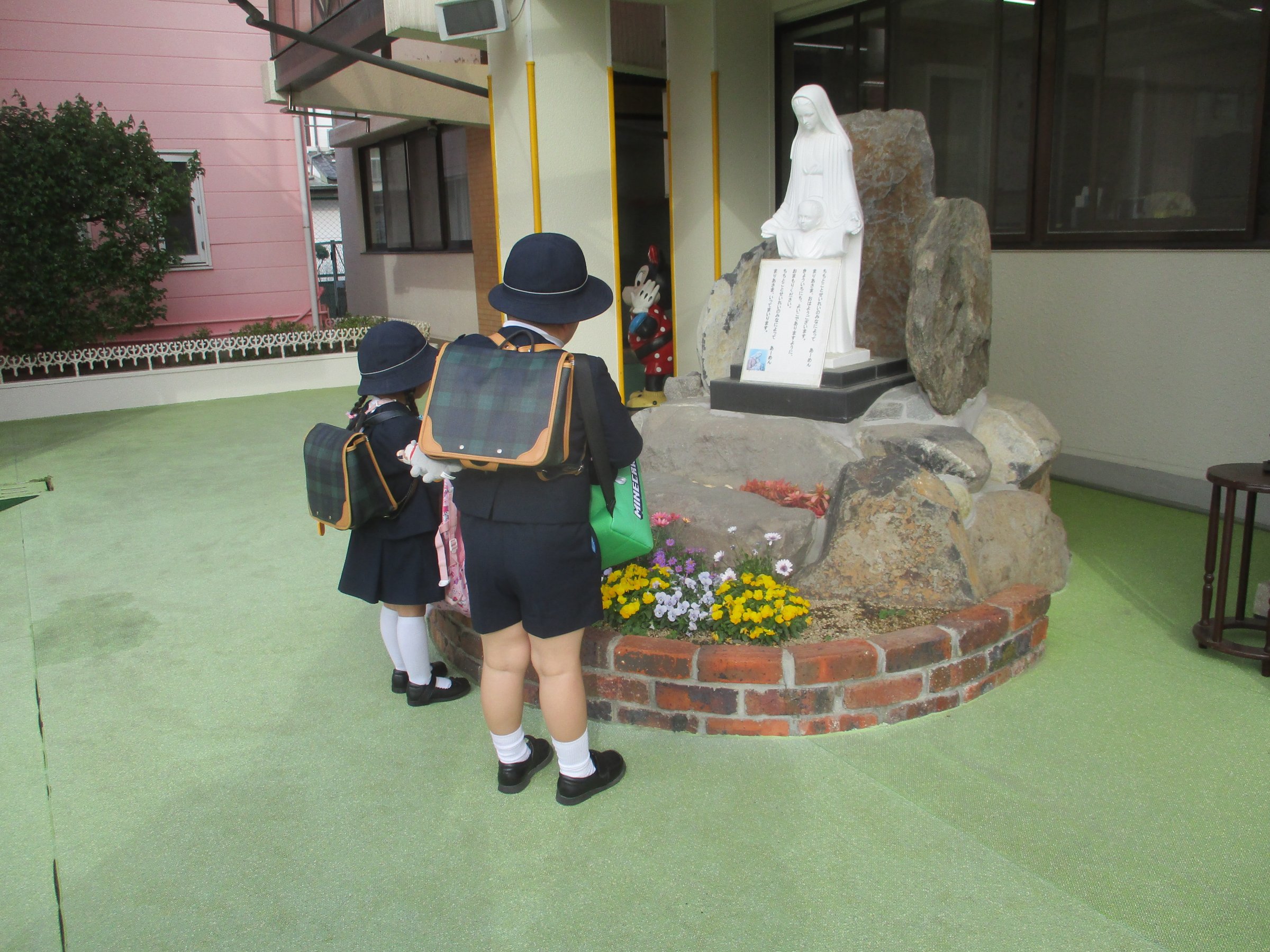 いっぱいのお花に囲まれたマリア様においのりをします。