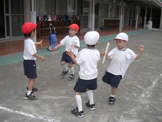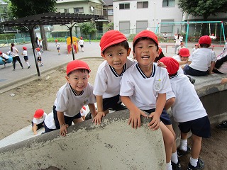 幼稚園に戻って園庭でリレー、綱引きをしました。
