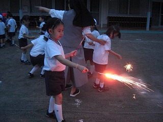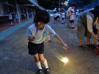 花火を見て「きれい~」とうっとり。打ち上げ花火は歓声が上がっていました。