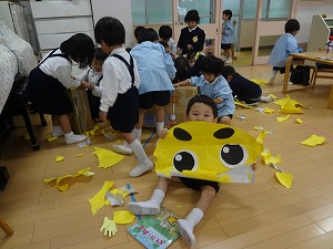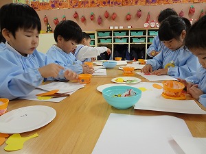 本番に使用するお面は子どもたちが自分で色を塗って、自分だけのお面を作りました☆