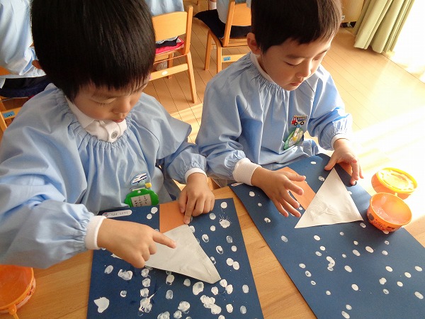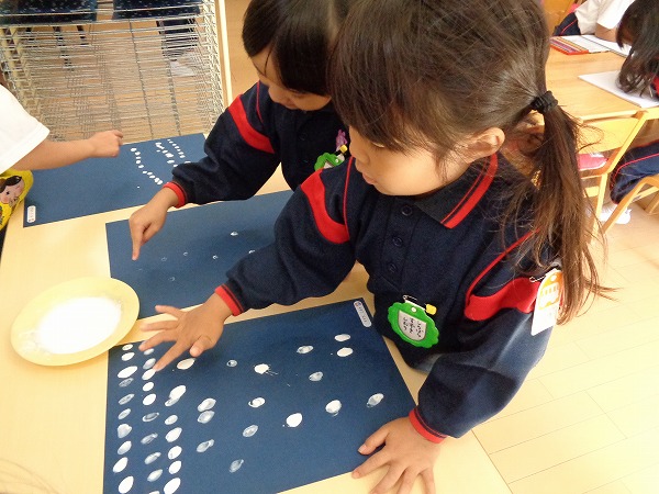 雪は、白の絵の具を人差し指で、画用紙に てん てん てん