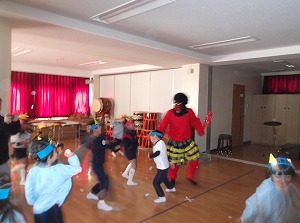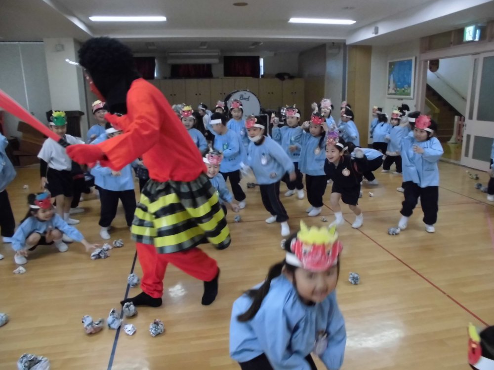 先生が氷大魔王となってみんなと鬼ごっこです。みんなニコニコ笑顔で楽しい体操の時間を過ごせました♡