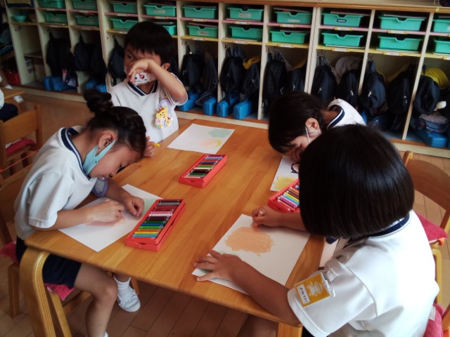 こちらは年中ばら組さん。お相手さんと手をつないでいきました。手紙の内容はスタンプでぶどうを作りました。