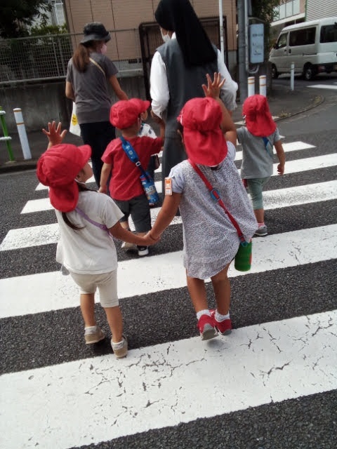 満三歳児のもも組さん。先生とクラスのお友達で初のお散歩!