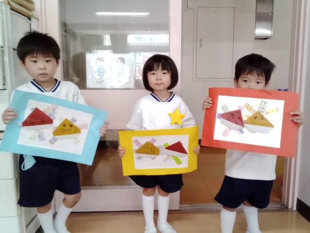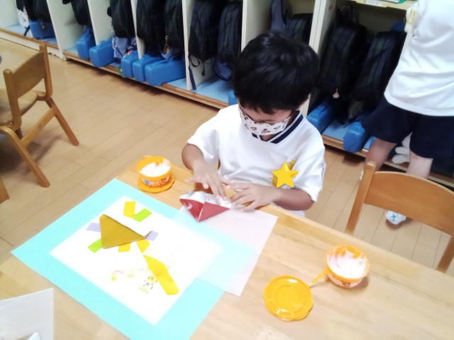 9月の製作は表に自分の顔を描き、裏には栗の「いが」と折り紙で折った「栗」をのりで貼り、目や口を描きました!