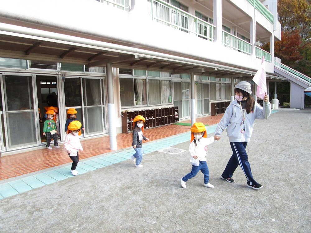 年少すみれぐみさん、満3歳のももさん。防災頭巾をかぶって静かに外に出ます。