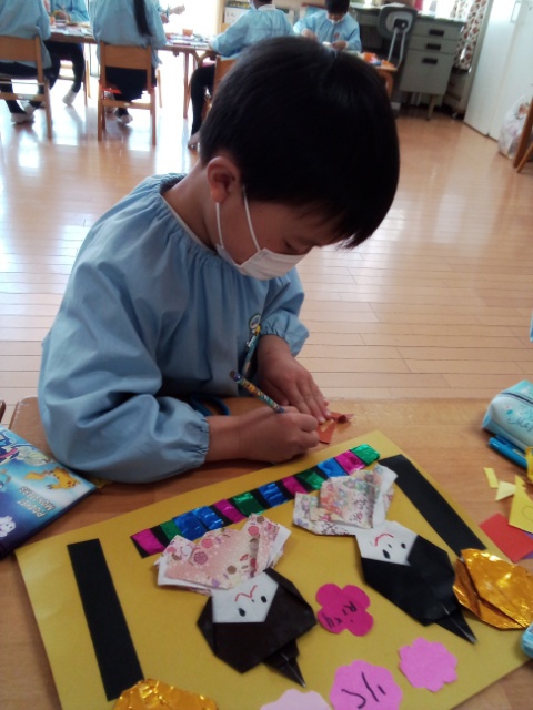 3月は、折り紙でひな人形を作りました。毎日一つずつ製作し、一週間ほどかけて完成させました。折り紙を折るのも上手になりました♪