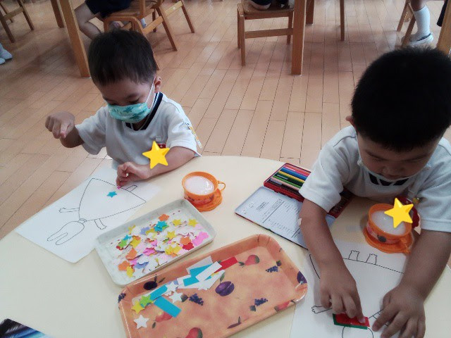 折り紙を自由に貼付け、のりを使う練習をしました!