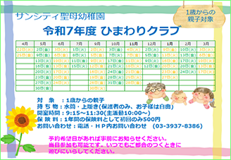 サンシティ聖母の子育て支援には「ひまわりクラブ(親子教室)」と「フレンドサークル(預かり保育)」があります。