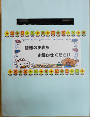保護者の皆様で、困ったり、悩んだりしていることがありましたら電話、書面、面接あるいは、玄関内に置いてある、「苦情受付ボックス」をご利用下さい。