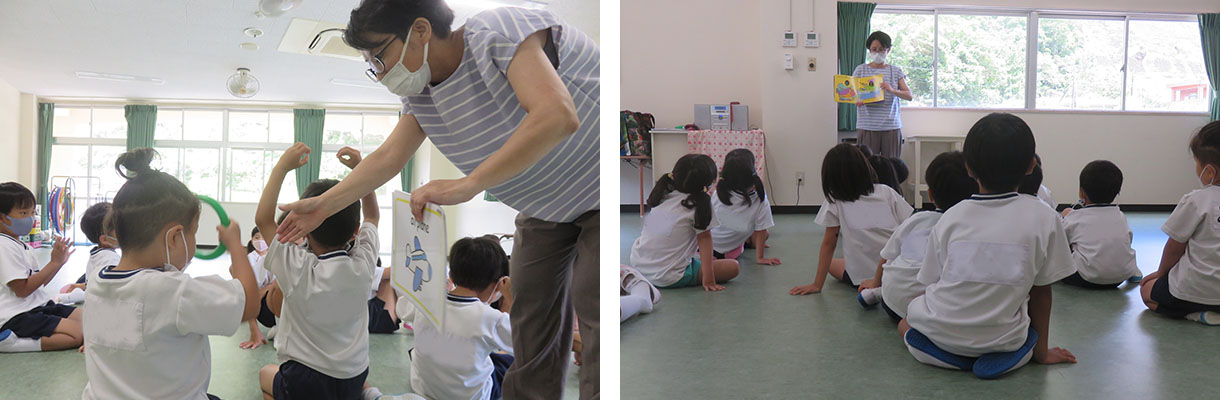 まるで、どこでもドアみたいなバックの中から大道具、小道具を次々と出しては子どもたちの興味を引き出す井上真由美先生。生活に密着した物や人物などを通して、英語を学んでいきます。