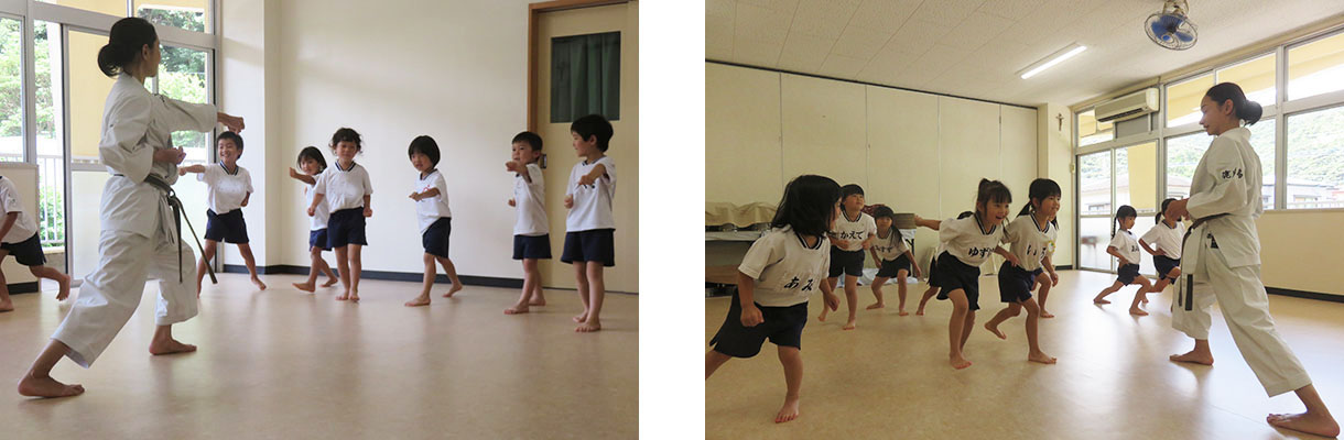 空手の指導をしてくださるのは西 京子先生です。子どもたちに礼儀と作法を盛り込んだ空手指導に心がけてくださいます。先生の指導に思いきり声を出して応えていく子どもたちは、この時間を楽しんでいます。