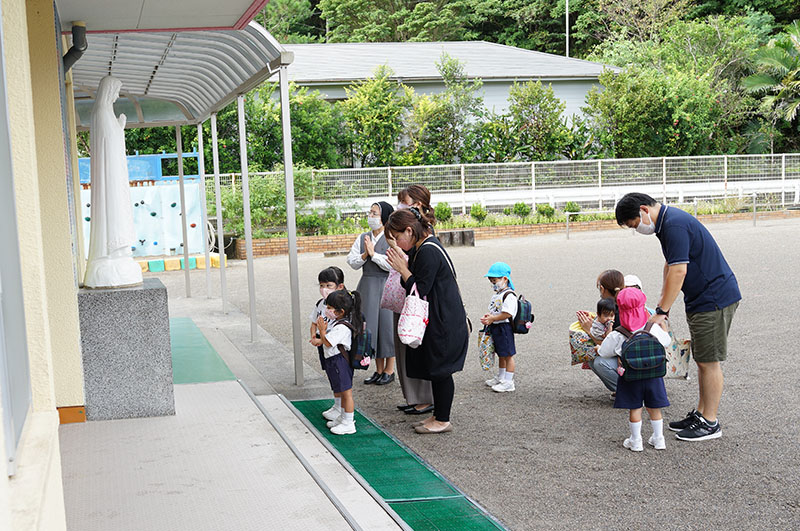 ●災害発生時に備え、毎月避難訓練を行います。地震・火災・津波・川の氾濫・不審者等の万一に備えて行政の指導に沿いつつも、名瀬聖母幼稚園独自のマニュアルを作成し危機感をもって訓練に臨んでいます。