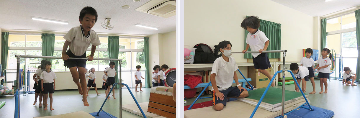 ティダスポーツクラブの先生方の指導によって、子どもたちの可能性は大きく伸びていきます。始まりは並び方や挨拶など身近なルールを学び、鉄棒・跳び箱・マット運動などの器械体操も3歳、4歳、5歳とどんどんレベルアップしていきます。