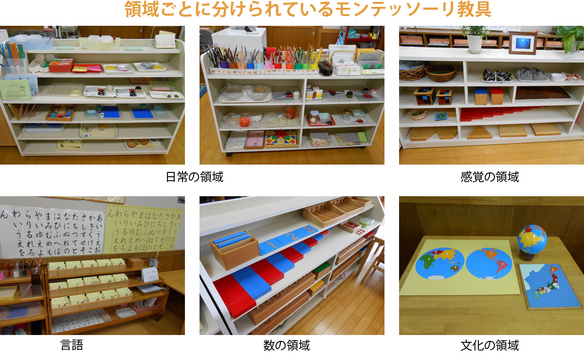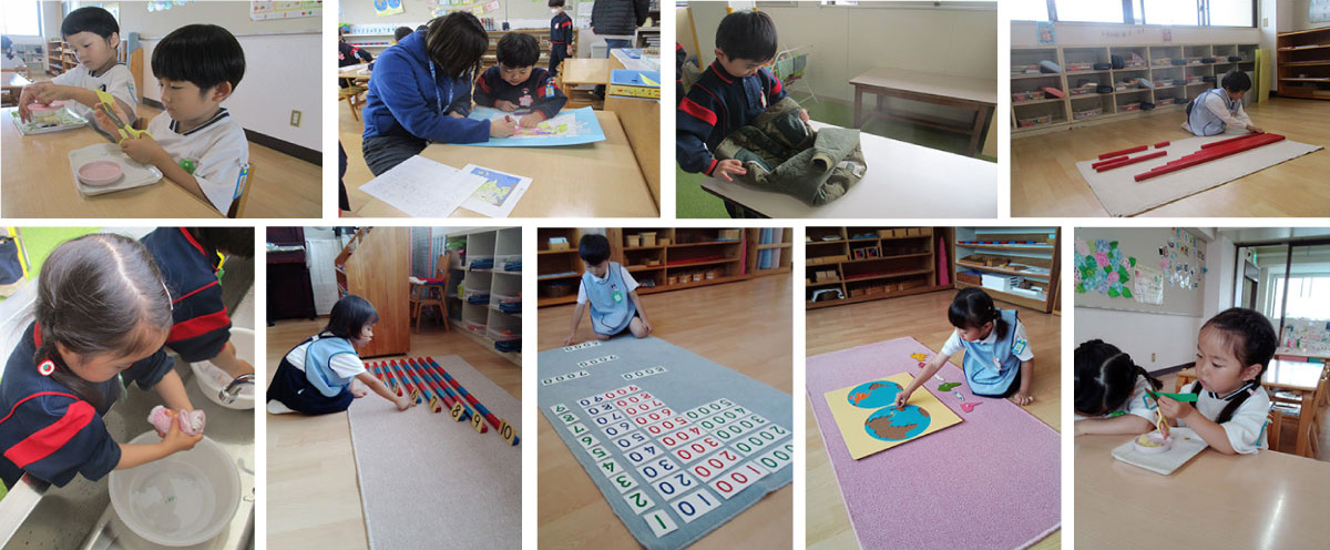 ●モンテッソーリ教育には、すべての活動の基盤となる日常生活領域・感覚領域・言語領域・数領域・文化領域に分けられ、子どもたちが自発的に学べるように保育室に各コーナーを設け、本物で美しい多彩な教材を整えます。教師は子どもの自主性を大切にし、子どもの中に自然に整えられている成長発達を促す原動力に信頼して、子ども自身が自ら成長していけるよう援助します。この活動を「おしごと」とよんでいます。