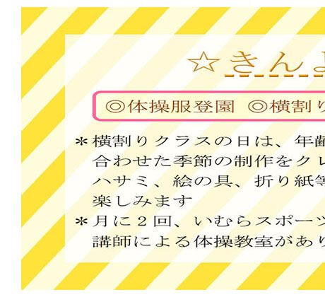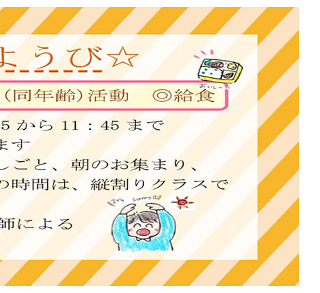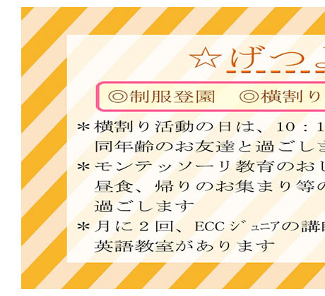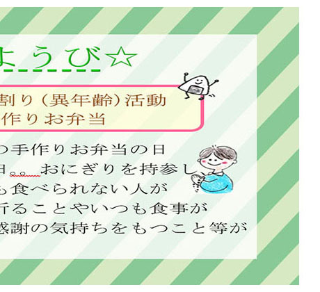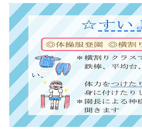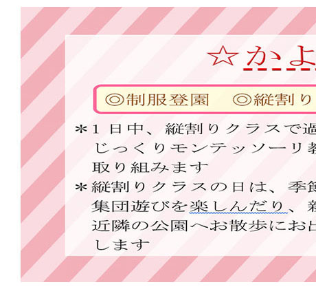 | 10:20~ | 主活動(基本は異年齢活動、同年齢の曜日や時間帯あり) 同年齢:英語・体操・マーチング・合奏・遊戯・絵画・園外保育 異年齢:音楽(歌)・遊戯(体操)・戸外あそび・室内あそび |