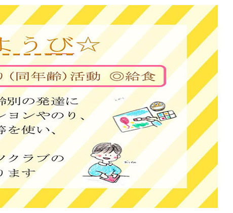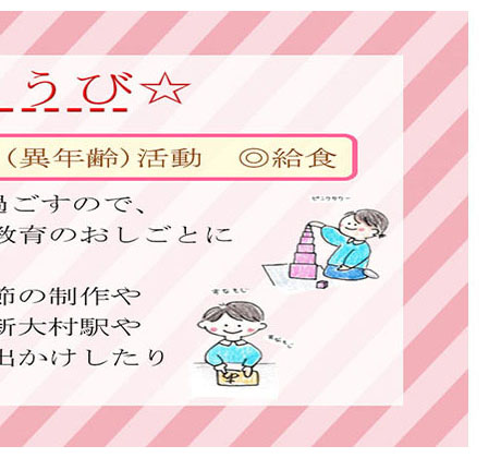 | 12:00~ | お弁当・給食 昼食後、戸外あそび、室内あそび |