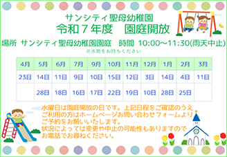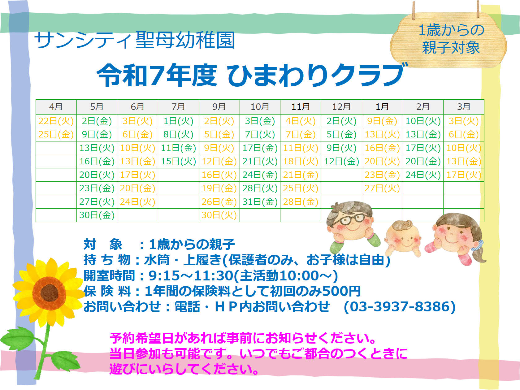 サンシティ聖母の子育て支援には「ひまわりクラブ(親子教室)」と「フレンドサークル(預かり保育)」があります。