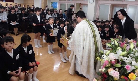 幼稚園のホールに神父様をお招きし、健やかな成長に感謝します。