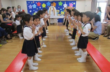 保護者の方と一緒に、生まれてきたこと、ここまで大きくなれたことを神様に感謝します。神父様から祝福もしていただきます。 - 聖母祭