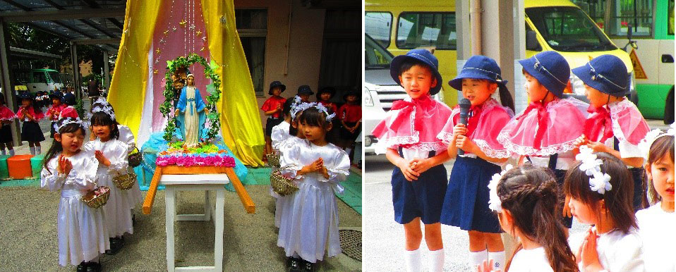 毎年5月の聖母月には、全園児と保護者が心を一つにしてマリア様をたたえます。「おともだちとなかよくする」「こころをこめておいのりをする」など子どもたちはお約束を決めて、マリア様に心の花束をお捧げします。 - 七五三